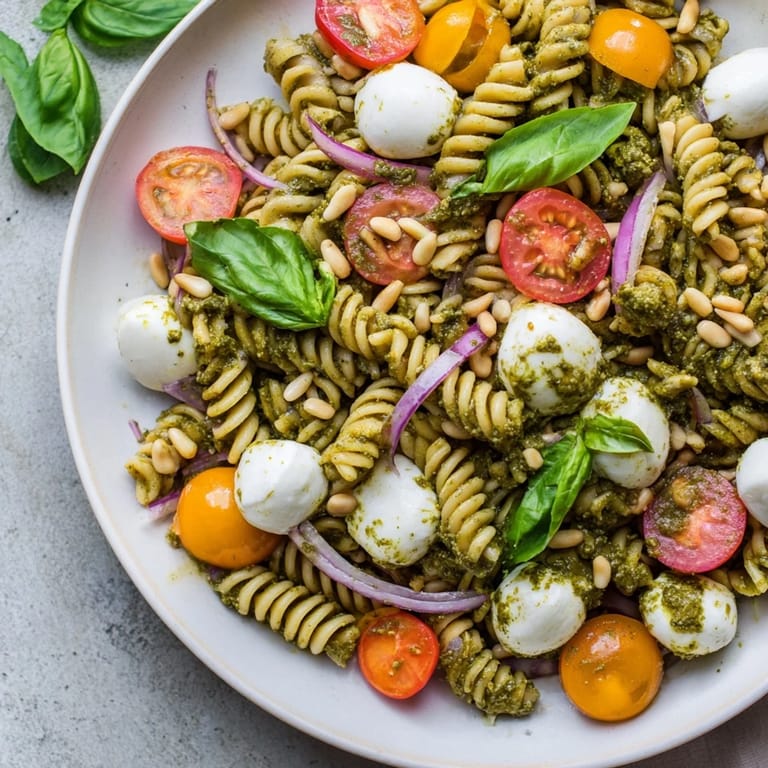 Save A vibrant, refreshing pasta salad featuring tender pasta, creamy mozzarella, juicy cherry tomatoes, and aromatic basil pesto—perfect for picnics or light lunches.