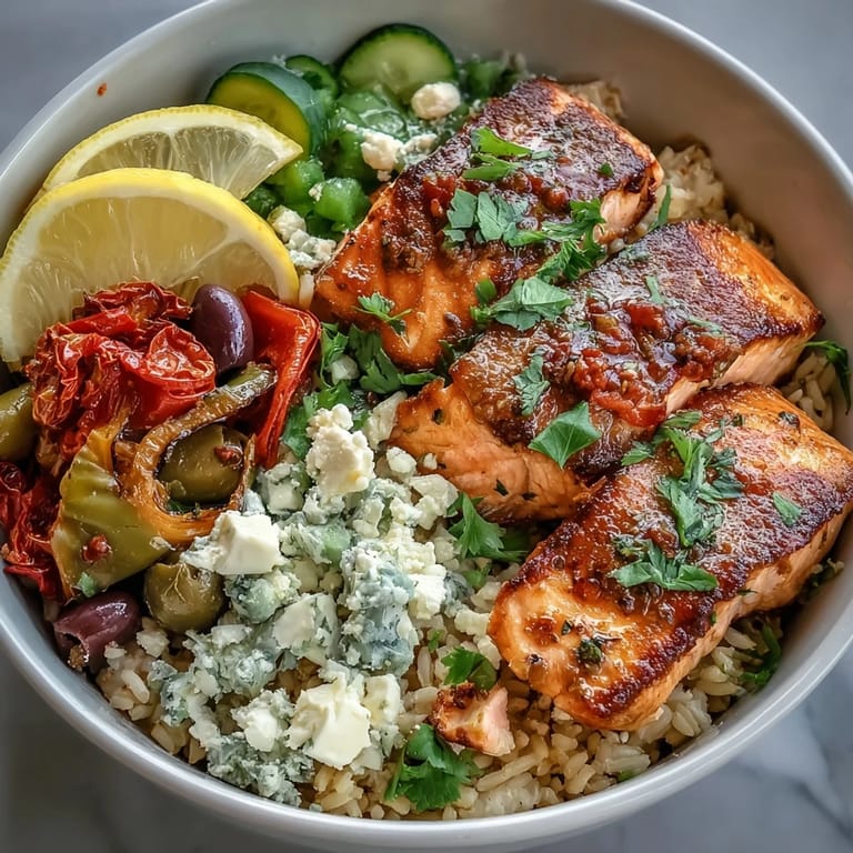 Save There's something about a bowl that makes you feel like you've got your life together, even when you're eating dinner at your desk at seven o'clock on a Tuesday. This Mediterranean salmon bowl came to life one evening when I had salmon thawing, leftover rice in the fridge, and a sudden craving for something that tasted like a sunny afternoon by the sea. The magic wasn't in any single ingredient—it was in how the crispy salmon skin sang against the golden, butter-soft rice underneath. I've made it dozens of times since, and it never gets old.