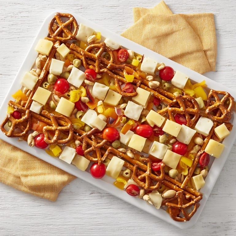 The genius of this platter is that it adapts to whatever's in your kitchen or whatever season you're in. In summer, I swap the cherry tomatoes for stone fruits and add fresh berries. In winter, I lean into cured meats and aged cheeses. The pretzel grid stays constant, but the ingredients inside become a conversation between you and what's available.